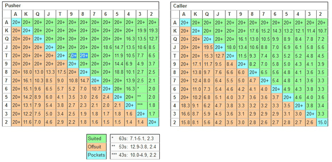 A naive thinking would be that the two charts should be equal. However looking quickly at it, we can see that the Pusher’s range is much wider than the Caller’s one. Indeed, the chart indicates that you can shove with 5-6 suited at any stack size, while the caller can only call this hand with a stack size lower than 4.6 Big Blinds.