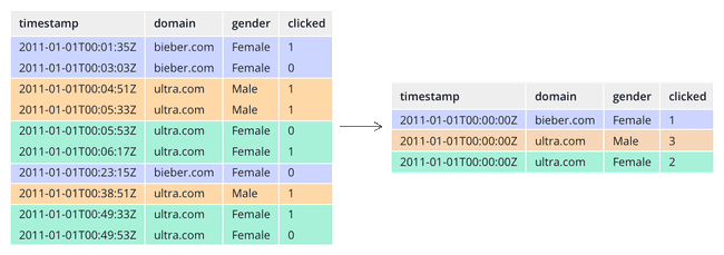 Druid has a pre-aggregation feature called the “Rollup”. At ingestion time, the system will not store individual records. Instead, it stores aggregations of these records based on the dimensions of the data as we can see in this example: