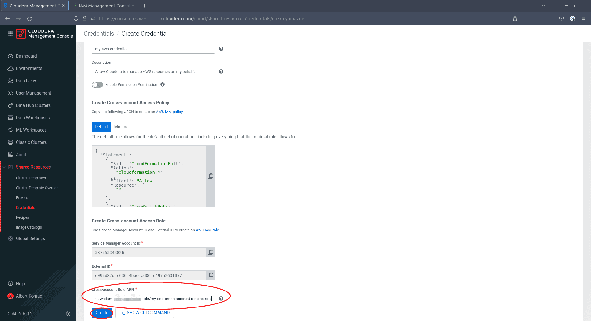 Go back to your CDP console and paste the ARN of your cross-account access role into the corresponding field, then click Create:
