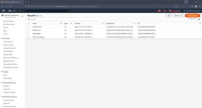 To create a new SSH key pair, access your AWS console and navigate to EC2 > Network & Security > Key Pairs. Make sure you are in the region you want to create your environment in and click Create key pair: